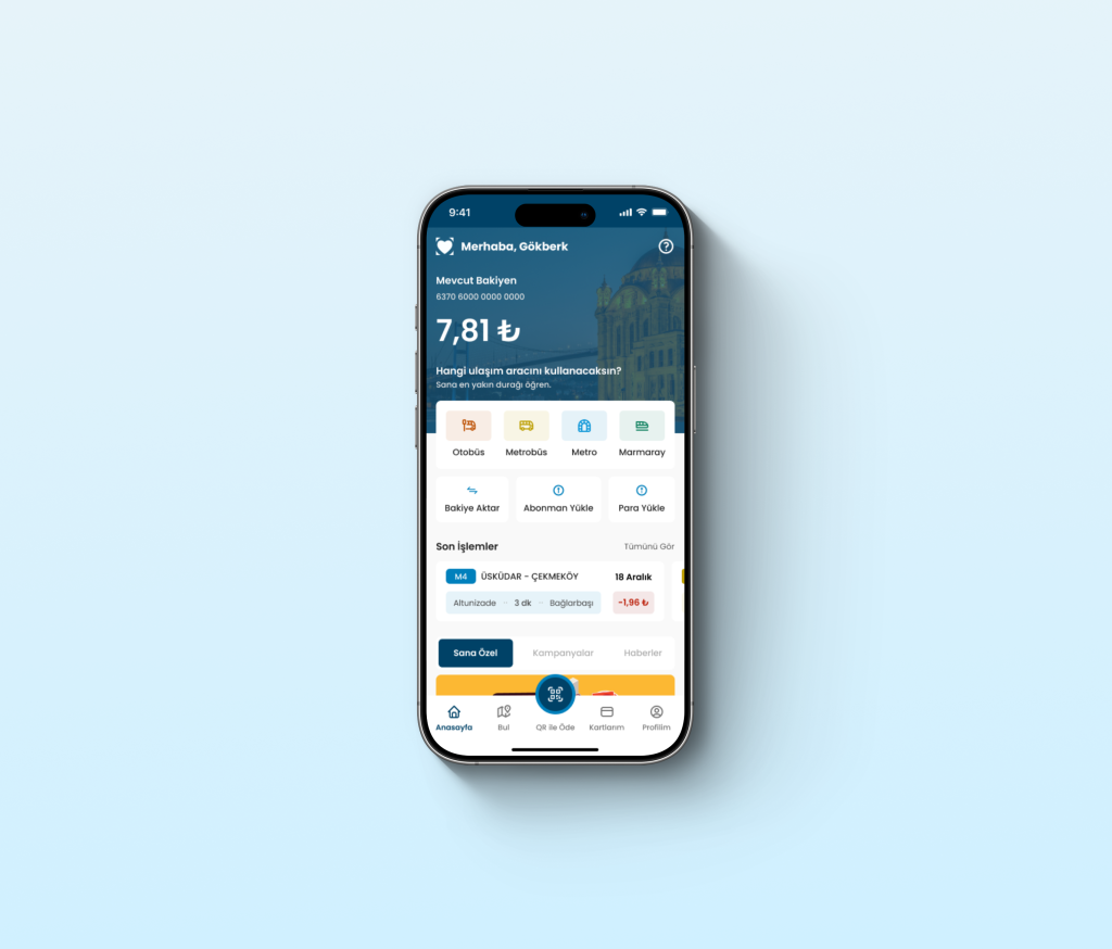 Anasayfa kullanıcıların ulaşım işlemlerine hızlıca erişebilmesi için bilgi mimarisi sadeleştirilmiş bir yapıda tasarlandı. Bu ekran, bakiye kontrolü, son işlemler ve hızlı menü fonksiyonlarını tek bir görünümde birleştirerek kullanıcıya zaman kazandırır.