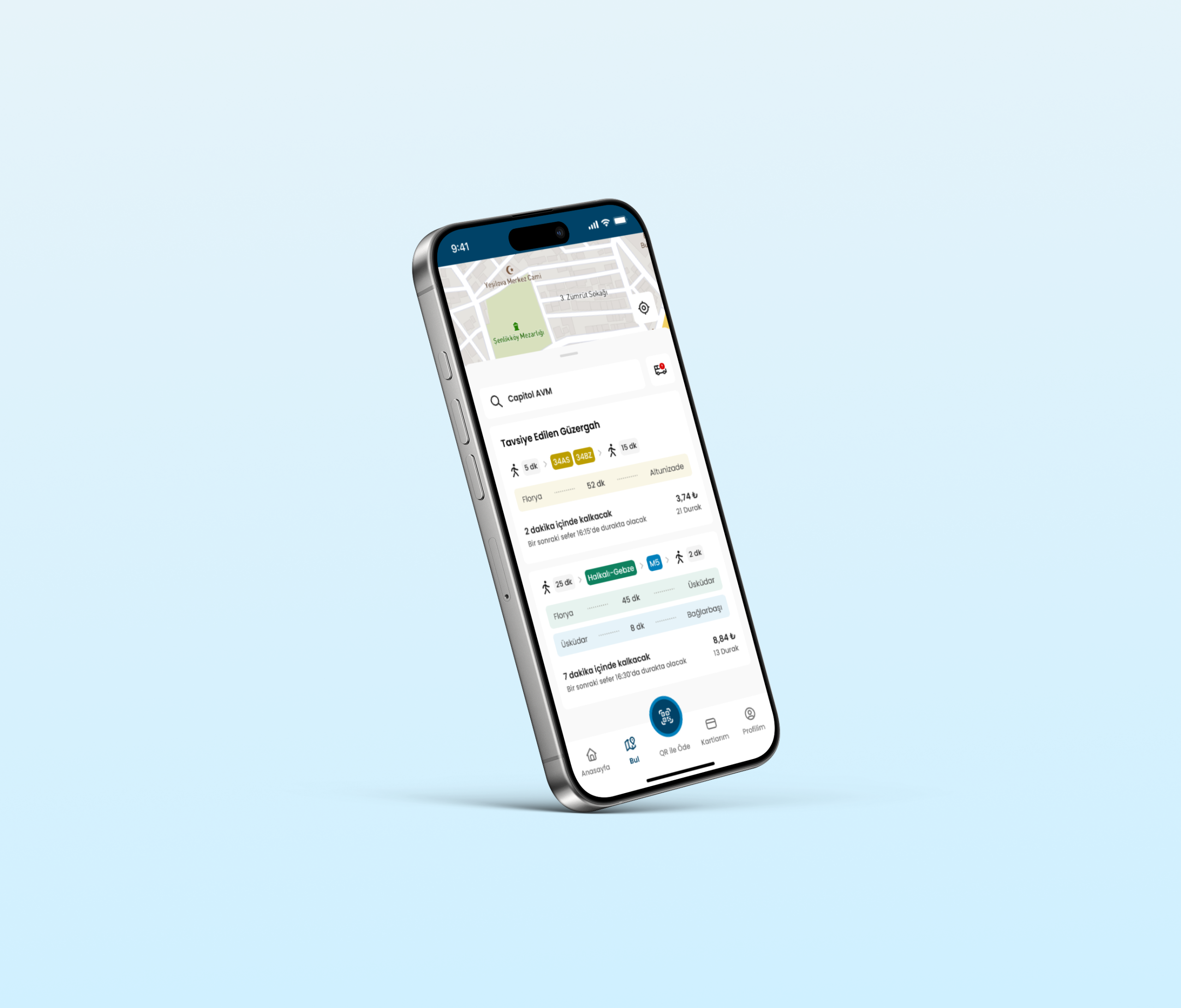 Harita ekranı, kullanıcının gitmek istediği konumu hızlıca arayabilmesi ve en uygun toplu taşıma güzergâhını anında görebilmesi için tasarlandı. Bu yapı, yön bulma sürecini sadeleştirir ve kullanıcıya zaman kazandırır.